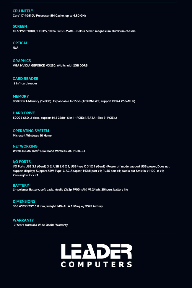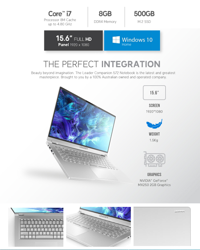 $1,799.00Read moreLeader Companion 572, 15.6″ Full HD 100% Matte, Intel i7-10510U, 8GB, 240GB SSD, 2GB Nvidia MX250 Graphics, IR Cam, Windows 10, 2yr war, Magnesium
