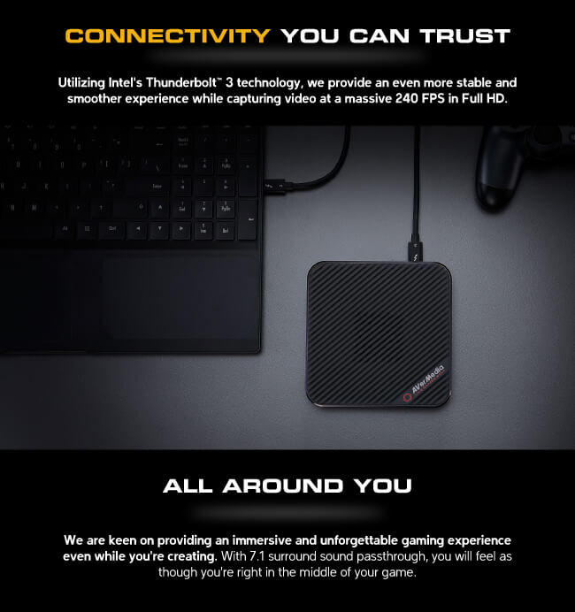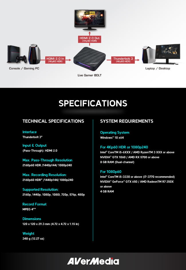 AVerMedia GC555 LIVE Gamer BOLT video Capture Box 4Kp60 HDR + FHD 240FPS RGB Lighting Effect, Thunderbolt 3 interface, HDMI 2.0, 3.5 Audio. 7.1 Passth