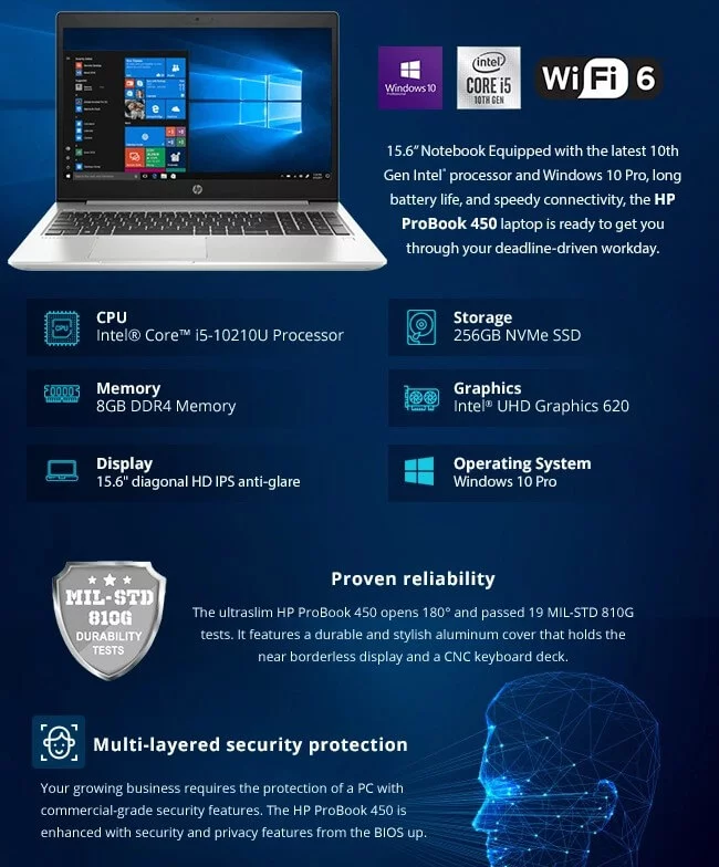 HP ProBook 450 G7 15.6″ HD Intel i5-10210U 8GB 256GB SSD WIN10 PRO