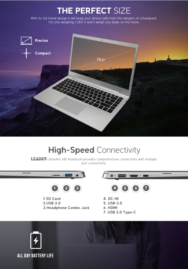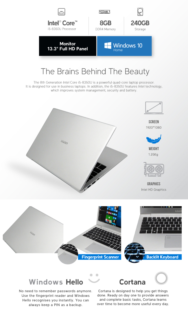Leader Companion 342 Ultraslim , 13.3″ Full HD, Intel i5-8350U, 8GB, 240GB SSD, Windows 10 Home, 2 year Warranty – Finger Print(FP), Metal, Backlit