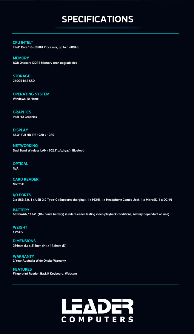 $1,049.00Read moreLeader Companion 342 Ultraslim , 13.3″ Full HD, Intel i5-8350U, 8GB, 240GB SSD, Windows 10 Home, 2 year Warranty – Finger Print(FP), Metal, Backlit