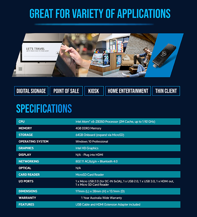 LEADER Intel PC Stick SC6, Intel Quad Core Z8350, 4GB, 64GB Storage, Windows 10 Professional, 1 year Warranty, USB, HDMI, Micro SD